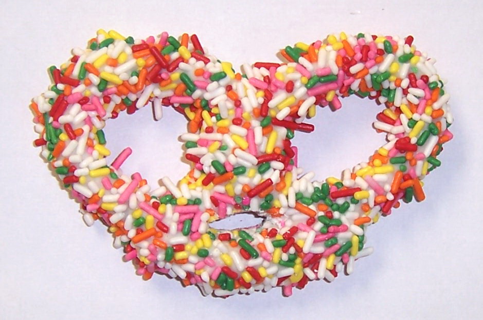 1 Pound White Chocolate Covered Pretzels with Rainbow Jimmies in a Decorative Bag