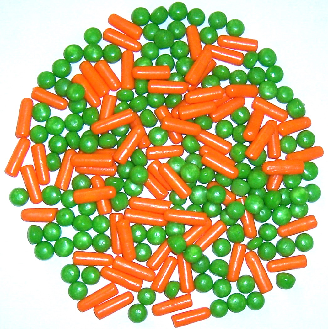 Eating your veggies never tasted so good! This delicious mellocreme mix features pea shapes in Green Apple Flavor, and carrot shapes in Orange Sherbet flavor. They make a great Easter treat, and year-round treat.