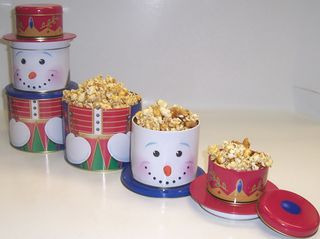 Snowy Contains: Bottom Tin Carmel Corn, Middle Tin Carmel Corn with Peanuts, Top Tin Carmel Corn with Pretzels.
